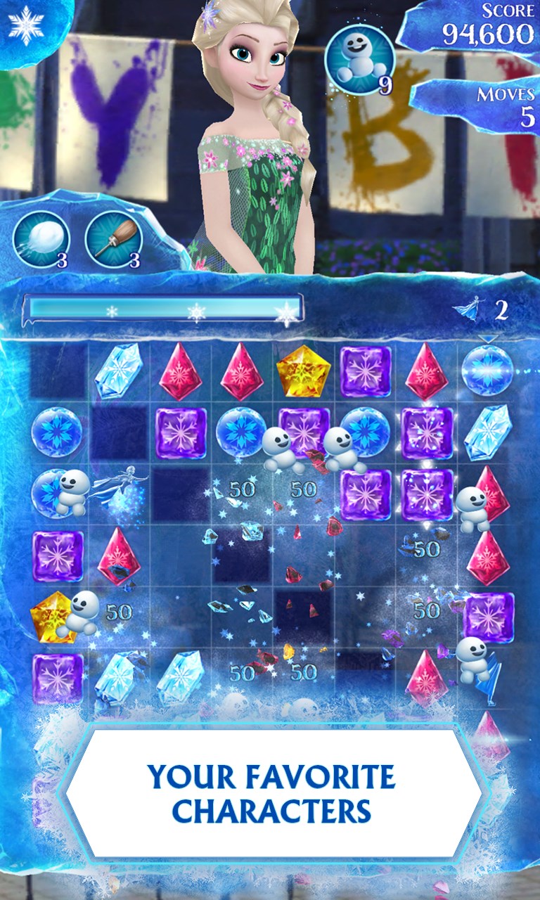 Достигнув где-то тридцатого уровня, у вас появляется возможность пользоваться помощью персонажей из мультфильма «Холодное Сердце». К примеру, у чудного снеговика есть способность расплавлять ледяные фишки, проливая на них горячий шоколад. Это очень помогает, когда вам нужно опустить специальные предметы на дно. Или же милая Анна метнет факелом и уничтожит до восьми фишек.