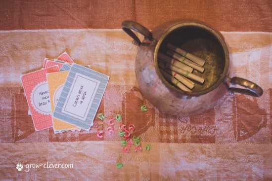 Распечатать и разрезать 31 карточку с заданиями и приятностями. Сложить карточки в красивую мисочку или баночку.