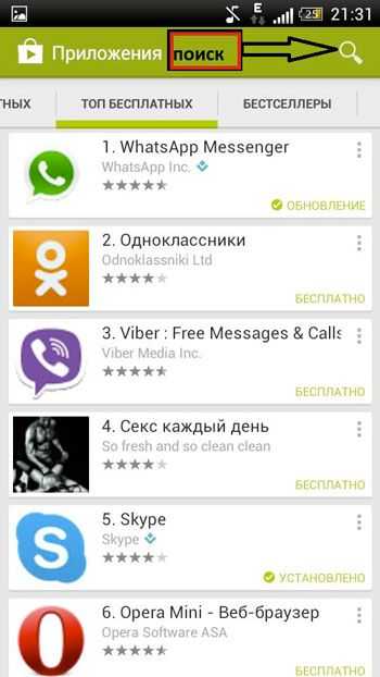 4.Отыщите раздел поиска (обычно он находится сразу в поле зрения — сверху, обозначается, как маленькая лупа) и введите туда название желаемой программы: «Whatsapp», начните поиск.